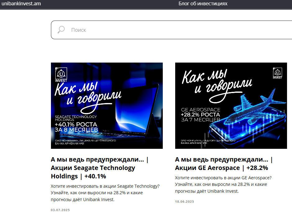 Инвест-брокер Unibank Invest предоставляет рекомендации и обучение отдельным вещам в своём блоге, который находится в шапке сайта.