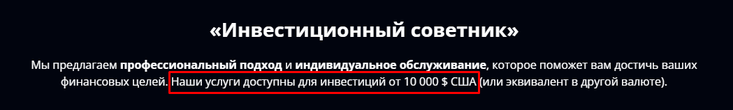 Точной информации по минимальному депозиту на сайте нет. Однако, минимум инвестиций указан при использовании услуг «Инвестиционного советника».