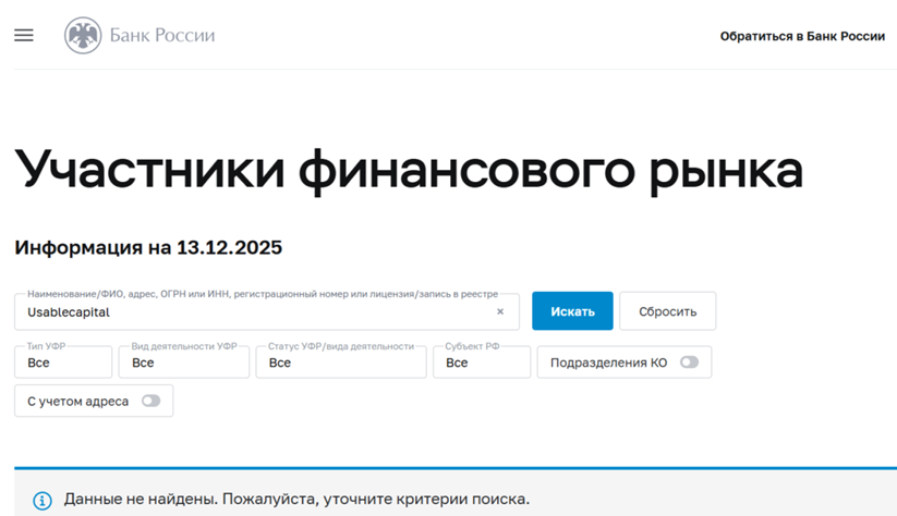 На сайте биржи Usable Capital указано, что это американский брокер, работающий с клиентами по всему миру. По словам разработчиков, у сервиса есть немало наград в данной сфере. Все дело в том, что компания не предоставляет доказательства легальной работы. Никакие документы не загружены на сайте. Проверка показала, что у брокера отсутствует лицензия Центрального Банка РФ.