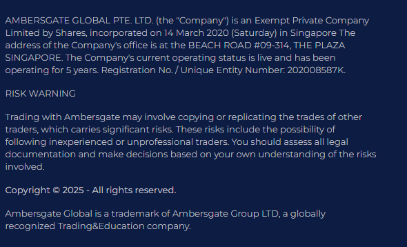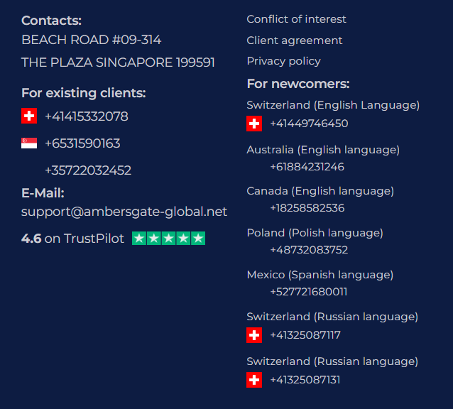 На сайте user ambersgate de world есть информация о юридическом лице, от имени которого производится обслуживание клиентов. Заявлено, что компания зарегистрирована в Сингапуре и получила лицензию в марте 2020 года.