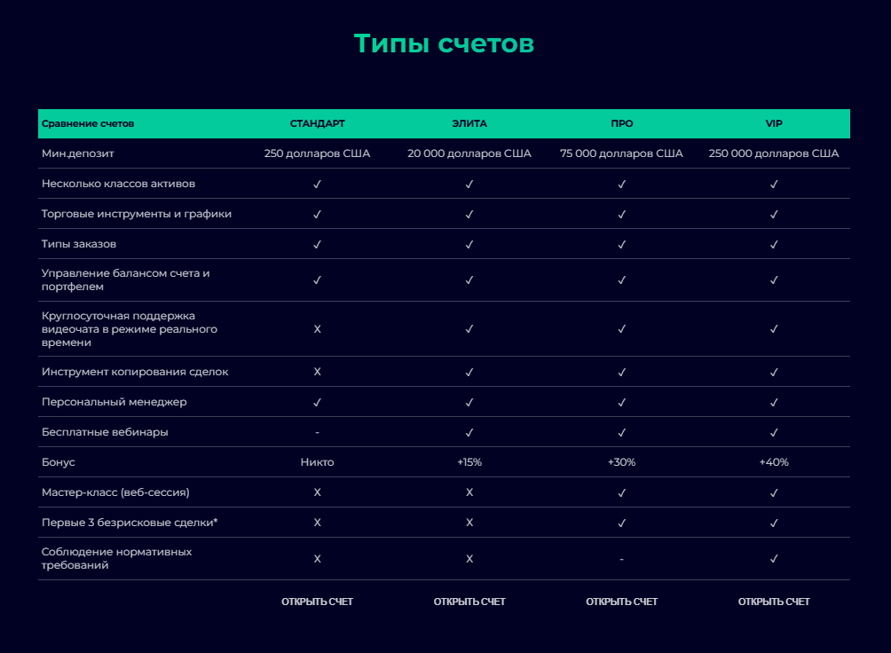 Мы изучали условия для трейдинга, ориентируясь на архивные версии сайта, позволяющие ознакомиться с типами счетов, доступными активами и прочими особенностями сотрудничества с компанией. Таким образом, удалось узнать, что организация предлагала зарабатывать на финансовых активах, криптовалюте, акциях и других ценных бумагах.