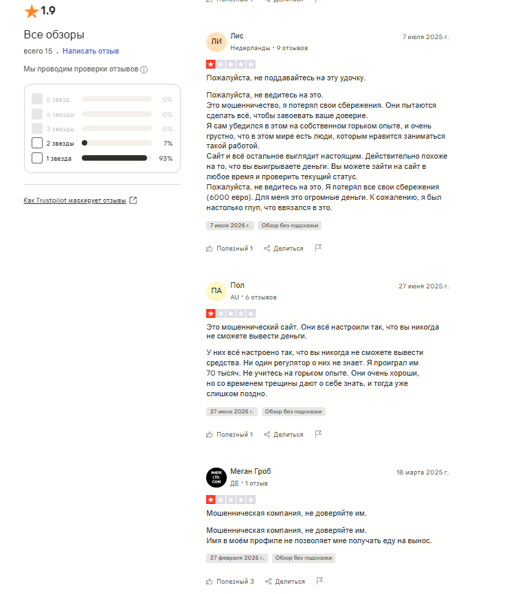 • Компания не имеет лицензии в России, что говорит о деятельности вне законодательства и возможных трудностях при выводе средств.