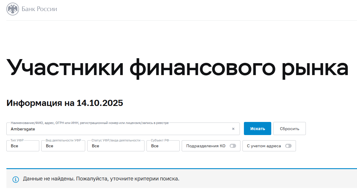 При этом сайт user ambersgate de world переведен на русский язык, что говорит о желании сотрудничать с клиентами из этого региона, но мы проверили организацию в реестре ЦБ.