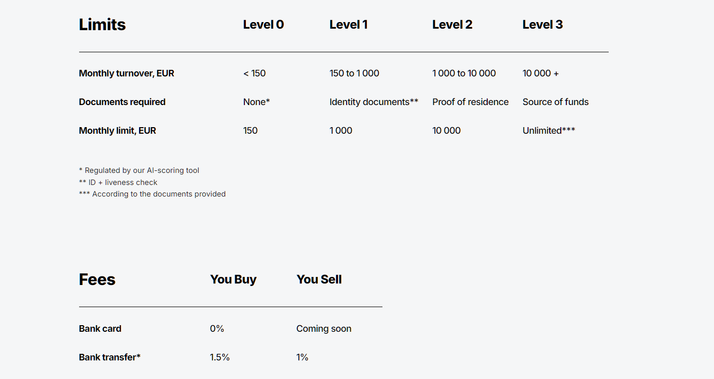- С верификацией личности, подтверждением паспортных данных в месяц можно совершать транзакции на сумму до 1000 EUR.