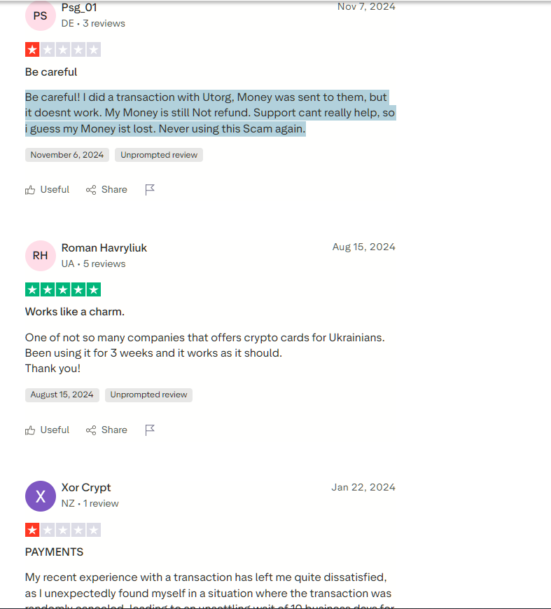 «Будьте осторожны! Я провёл транзакцию через Utorg. Деньги были отправлены им, но ничего не работает. Деньги до сих пор не возвращены. Служба поддержки ничем не может помочь, так что, похоже, мои деньги потеряны. Больше никогда не воспользуюсь этим мошенничеством»
