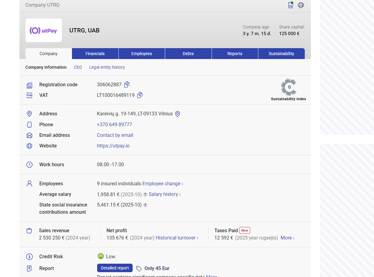 Криптовалютная биржа Utorg официально зарегистрирована в Литве, имеет лицензию на ведение финансовой деятельности, работу с криптовалютными активами. Выручка от продаж компании в 2024 году составила 2 530 250 €.