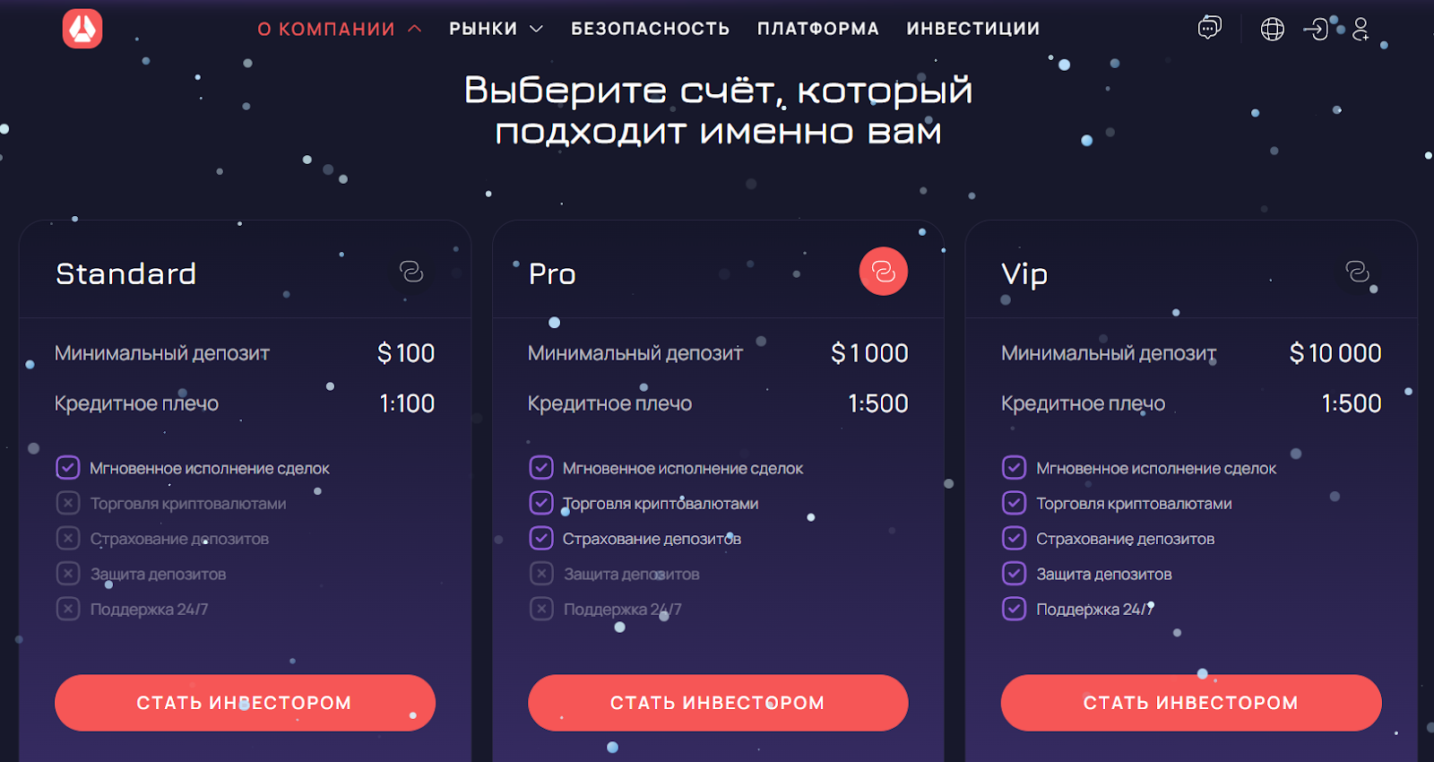 - VIP – минимальный депозит от $10,000, плечо 1:500. Обещают полный набор услуг: криптотрейдинг, страхование и защиту депозитов, поддержку 24/7, однако конкретных условий и документов по этим «гарантиям» не раскрывают.