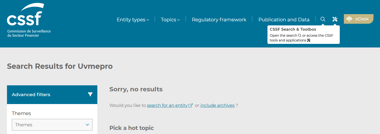 Проверяя наличие данных о брокере Uvmepro на сайтах регуляторов, можно заметить отсутствие реальных документов. Например, на официальном ресурсе CSSF вовсе не упоминается такая компания.