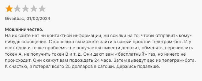 Внимательно прочитав все доступные отзывы о Uxuy Wallet, мы нашли несколько упоминаний того, что проект принадлежит аферистам. Пользователи сообщают, что их обманули при попытке вывести депозит и заблокировали аккаунта в телеграмм-боте.