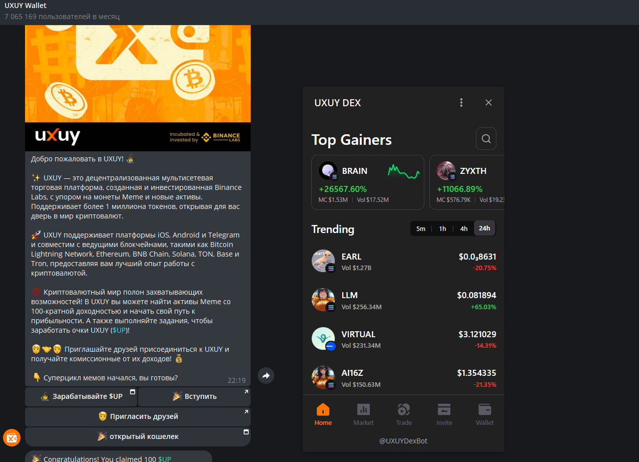 Главным преимуществом проекта является его доступность в мессенджере. В Telegram Uxuy работает как веб-приложение, доступное через бота Uxuybot.