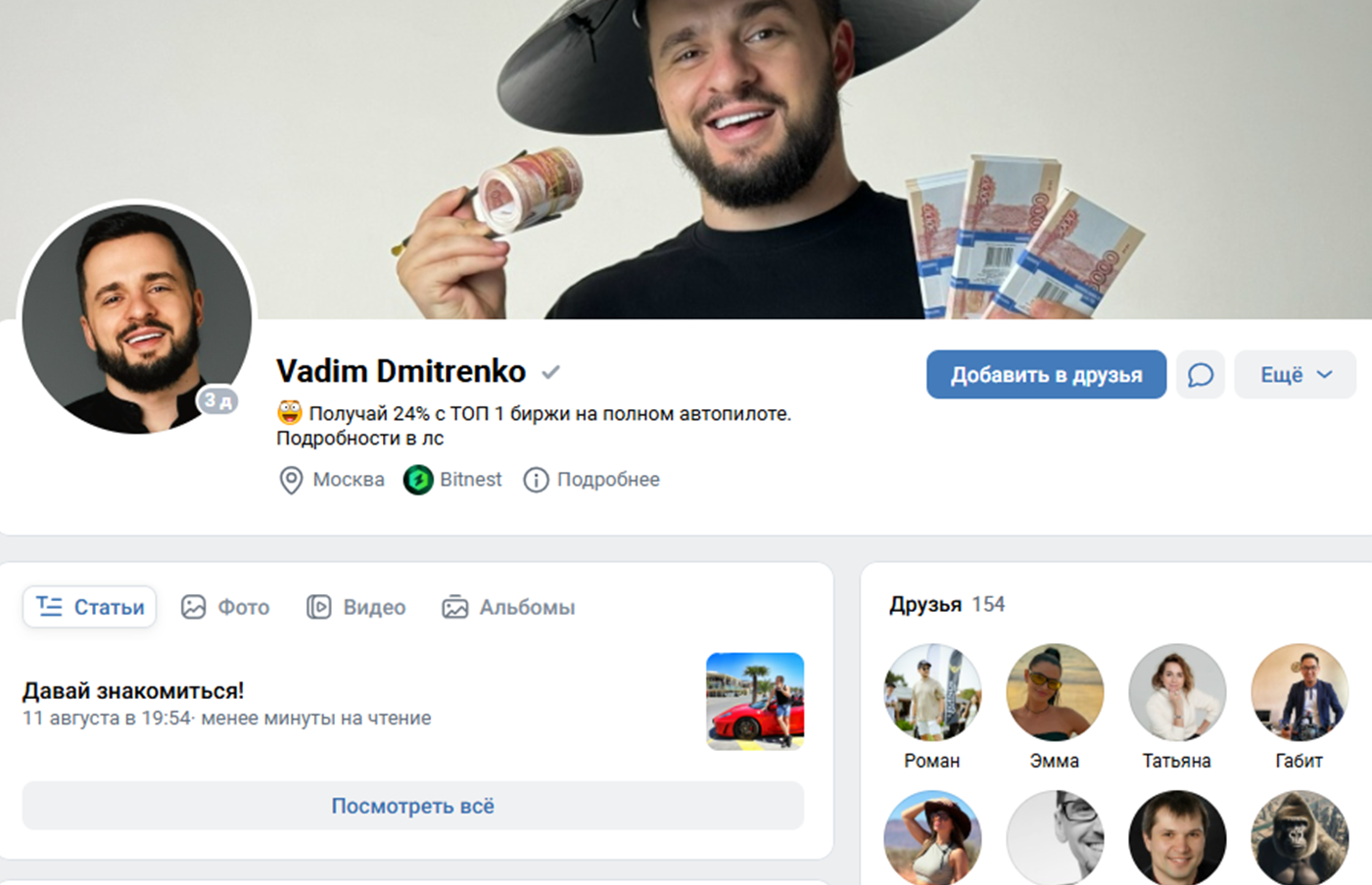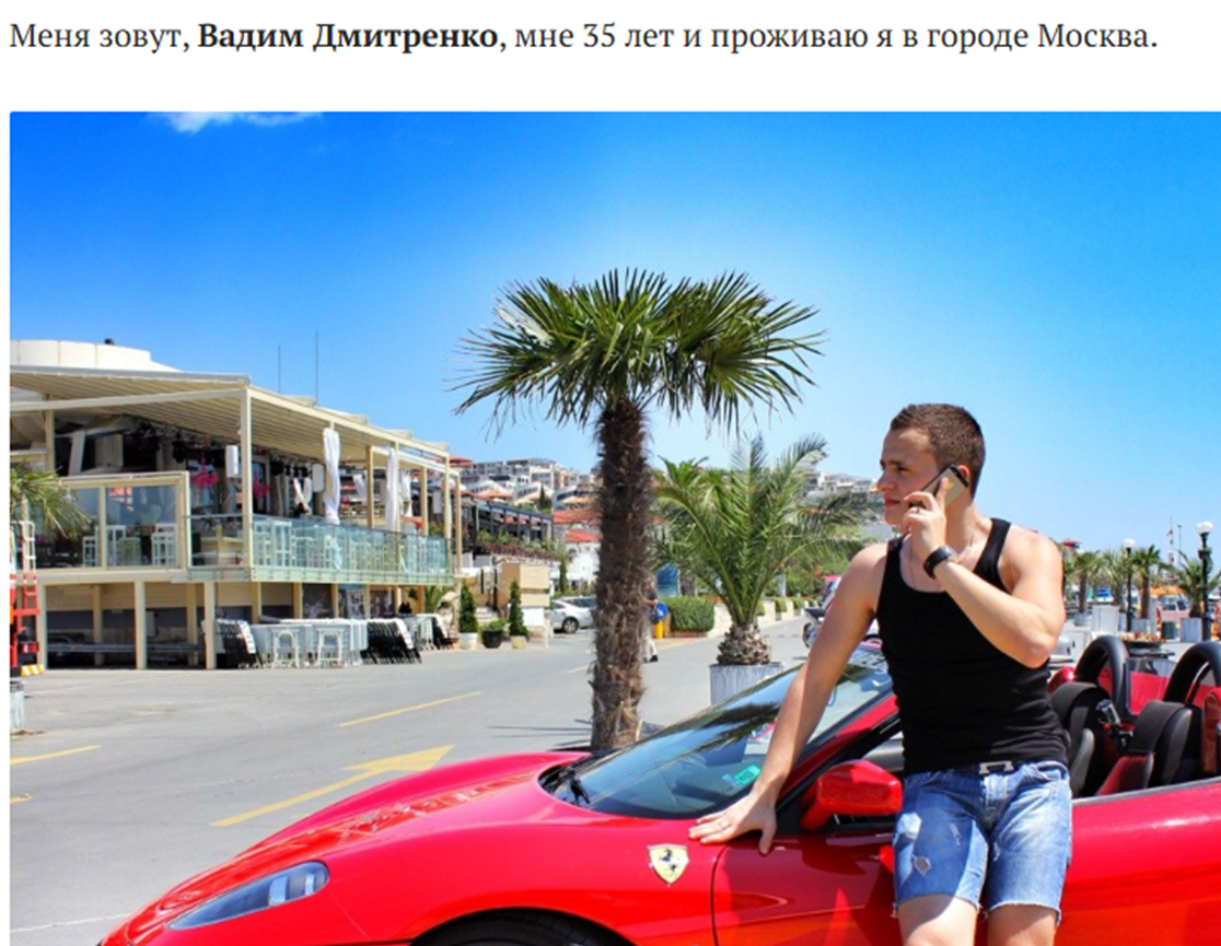 Вадим Дмитренко рассказывает о себе немного, но факты о своей деятельности приводит впечатляющие. Мужчине 35 лет, живет в Москве и зарабатывает от 300 000 рублей в месяц, причем его доход выстроен пассивно.