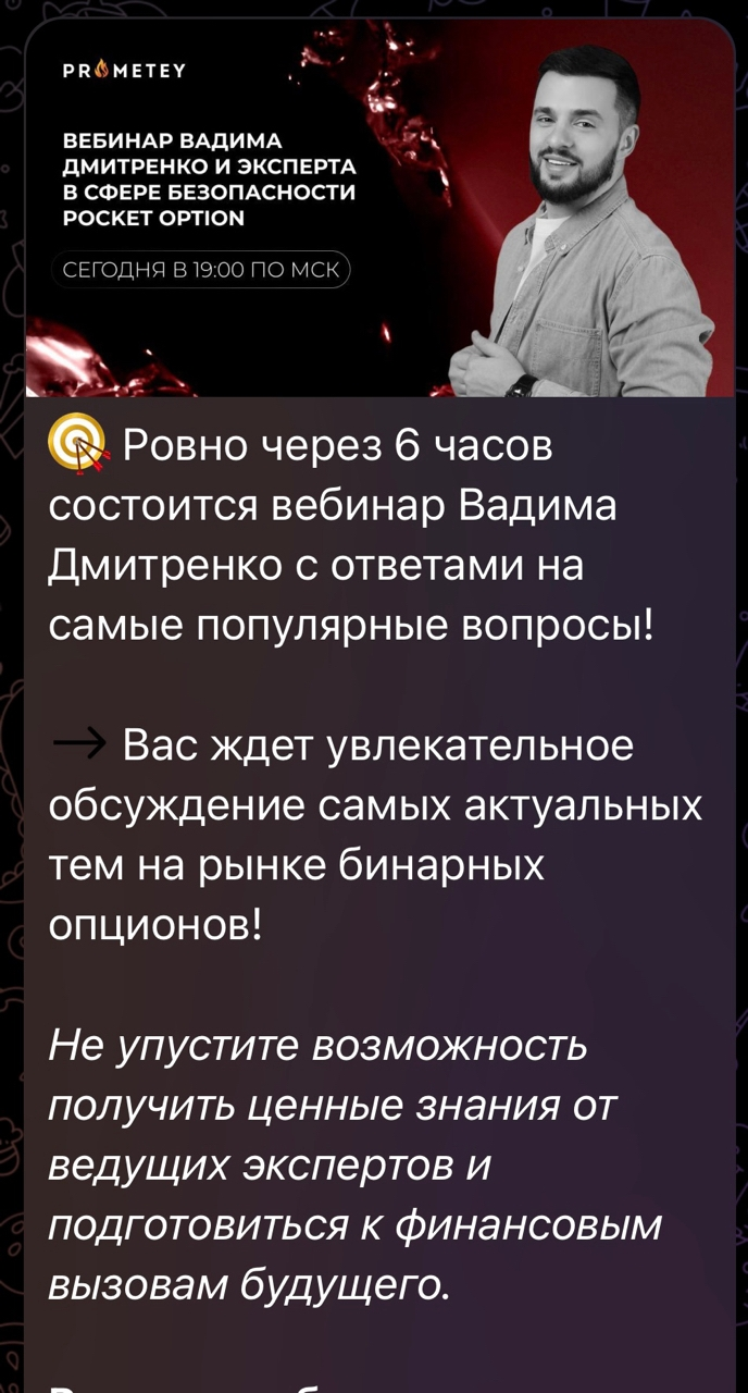 Здесь много информации о боте, его особенностях. В более ранних публикация постоянно присутствовали ссылки на вебинары от Вадима Сенсея Дмитренко, гордо именовавшего себя экспертом по безопасности торговой платформы Pocket Option. Примечательно, что никакими фактами эти слова подкреплены не были.Стоимость запуска торгового софта Prometey – 100 долларов за базовую вариацию бота и 300 – за продвинутую. Подписка оплачивается один раз на 3-6 месяцев. Торговля осуществляется исключительно бинарными опционами на Pocket Option, с другими брокерами софт не работает.