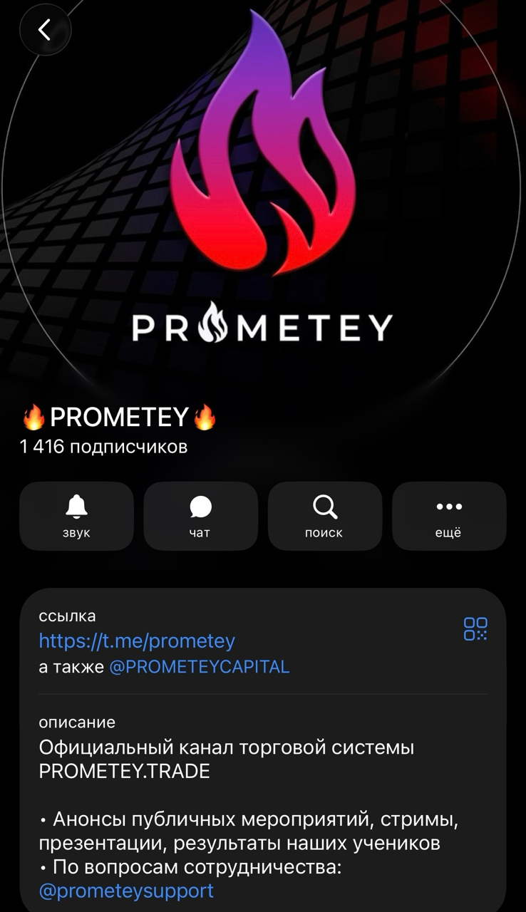 В телеграм-канале Prometey, у которого порядка 1400 подписчиков, схожая картина. Аккаунт создан исключительно для рекламы одноименного торгового бота.