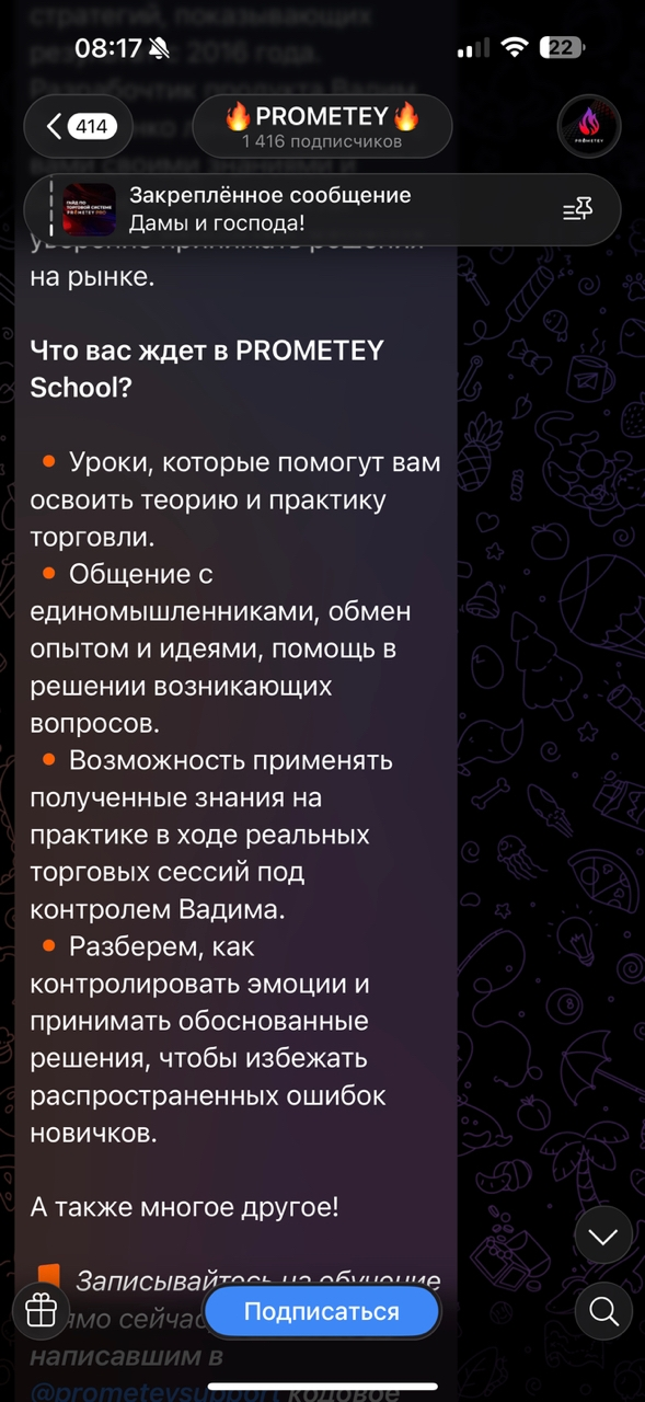 Примечательно, что позже на канале стали появляться анонсы школы трейдинга Prometey. В январе 2025 Вадим стал активно рекламировать услугу обучения у него, но насколько оно эффективно и какова программа, неизвестно.