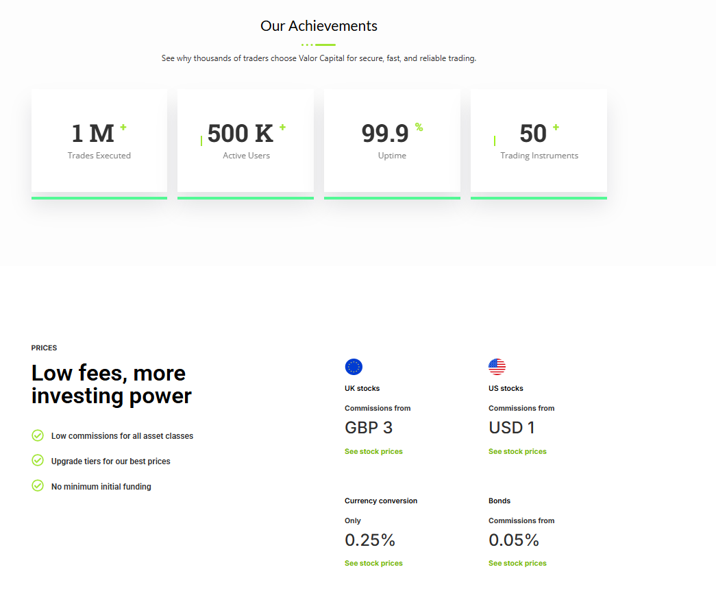 Обещаются низкие комиссии от 0,08% за акции Великобритании с минимумом в три фунта стерлингов или от одного доллара за акции США. Плюс всего 0,25% за конвертацию валюты. Подчеркивается отсутствие минимального начального депозита. Однако реальные условия спредов, свопов и скрытых сборов за вывод остаются без деталей на сайте. Биржа заставляет пользователей регистрироваться и вносить деньги, чтобы узнать информацию.