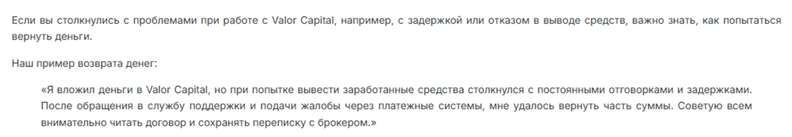 На основе анализа деятельности брокера Valor Capital можно выделить проблемы, которые ставят под сомнение безопасность проекта: