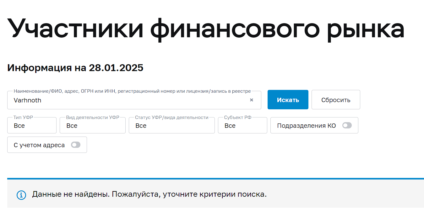 Мы проверили, есть ли у компании лицензия от Центробанка. На сайте cbr.ru в реестрах легальных организаций Varhnoth не оказалась.