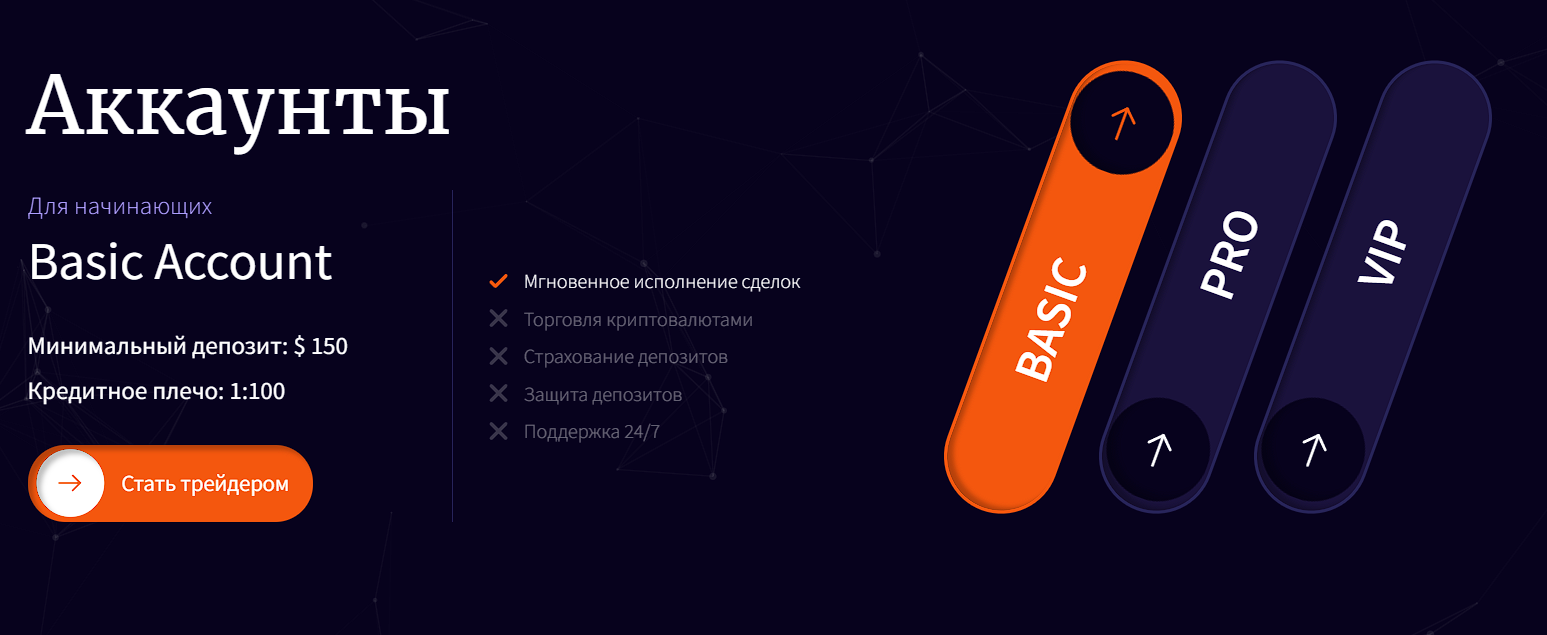 Существует три тарифа, которые автоматически открываются при определённой сумме на счёте. Basic даёт маржинальное плечо 1:100, минимальный депозит для него – 150 долларов. Для Pro нужно внести на счёт не менее 5 000 долларов, для VIP – 25 000 долларов. Для продвинутых аккаунтов брокер предоставляет кредит 1:500. Это высокий займ, использование которого связано с рисками потери средств.