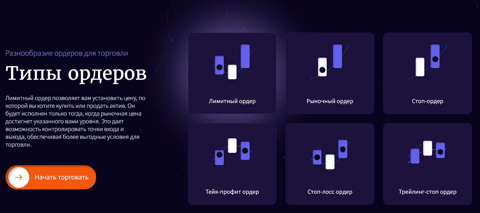 Трейдерам обещают доступ к популярным ордерам и их быстрое исполнение. Среди них: трейлинг-стоп, лимитный, рыночный ордер, стоп-лосс, тейк-профит. Нет информации о типе терминала, на котором будет проходить торговля.