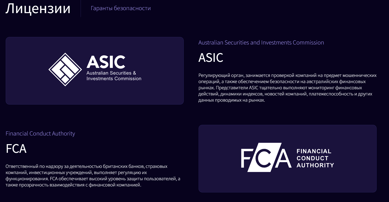 Представители компании заявляют, что у брокера есть лицензии от таких регуляторов, как CySEC, FCA, DFSA и ASIC. Это 4 ведущих организации, осуществляющих контроль деятельности финансовых организаций. На сайте оставлены ссылки на сайты с юридической информацией о брокере. Вызывает сомнение, что доменные имена ресурсов не совпадают с официальными сайтами регуляторов. Например, ссылка ведёт на dubai-finance-certifications.net, однако настоящая платформа DFSA находится по адресу dfsa.ae.