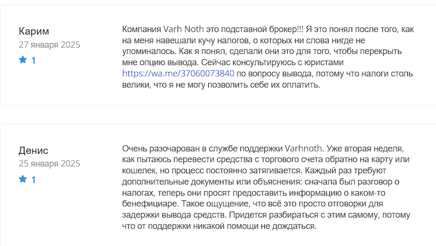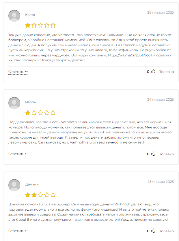 В интернете есть более 10 негативных обзоров брокера. Авторы статей не доверяют компании из-за отсутствия юридических документов и подмены важной информации. На сайте vsyapravda.net мы нашли 3 отрицательных отзыва о Varhnoth. Пользователи утверждают, что им не дали вывести средства или требовали оплатить дополнительные комиссии, переводить средства на карты третьих лиц, чтобы не платить налоги.
