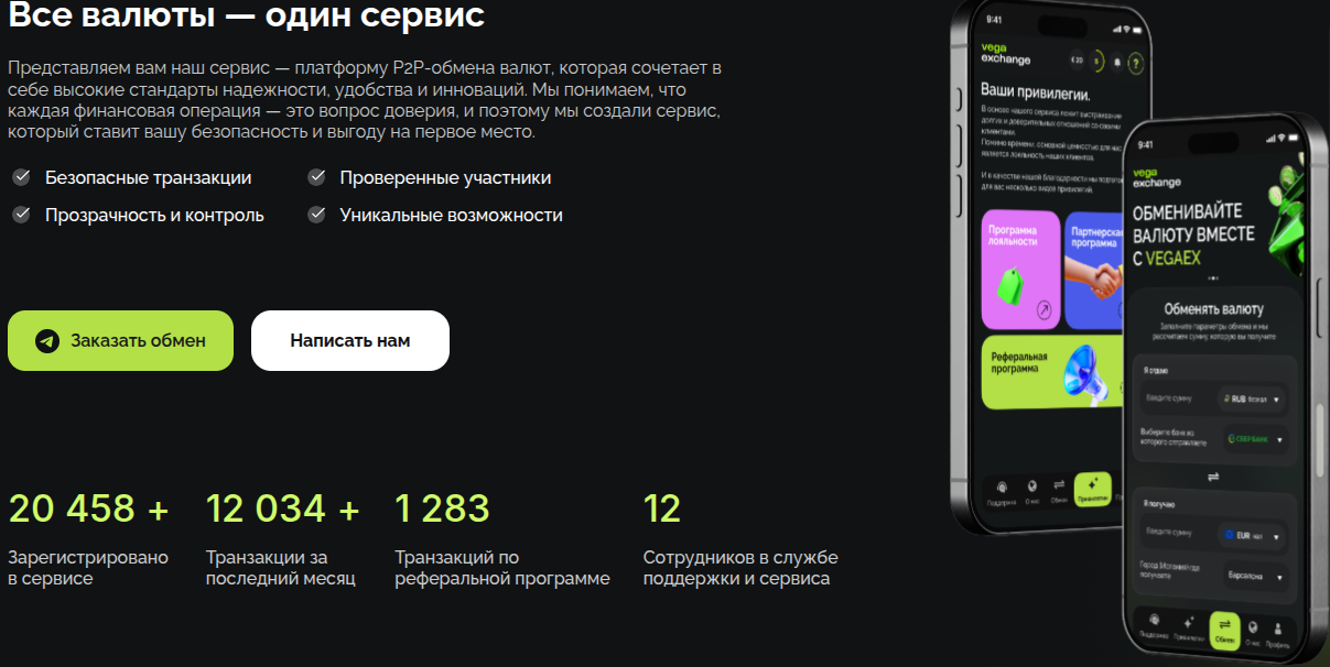 Разработчики сервиса Vega Exchange позиционируют финансовую платформу как ресурс, который позволяет торговать активами через p2p-модуль. Это значит, что пользователи могут напрямую покупать и продавать активы, инвестировать доллары или получать наличные деньги.