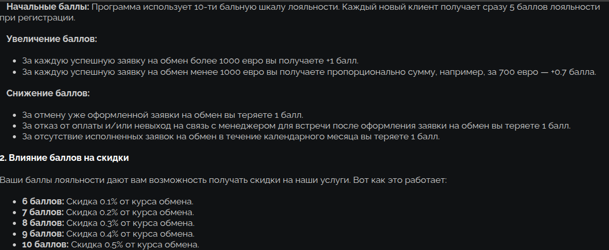 За 10 очков пользователь получает 0.5% от курса обмена, 9 — 0.4%, 8 — 0.3%, 7 — 0.2%, 6 — 0.1%.