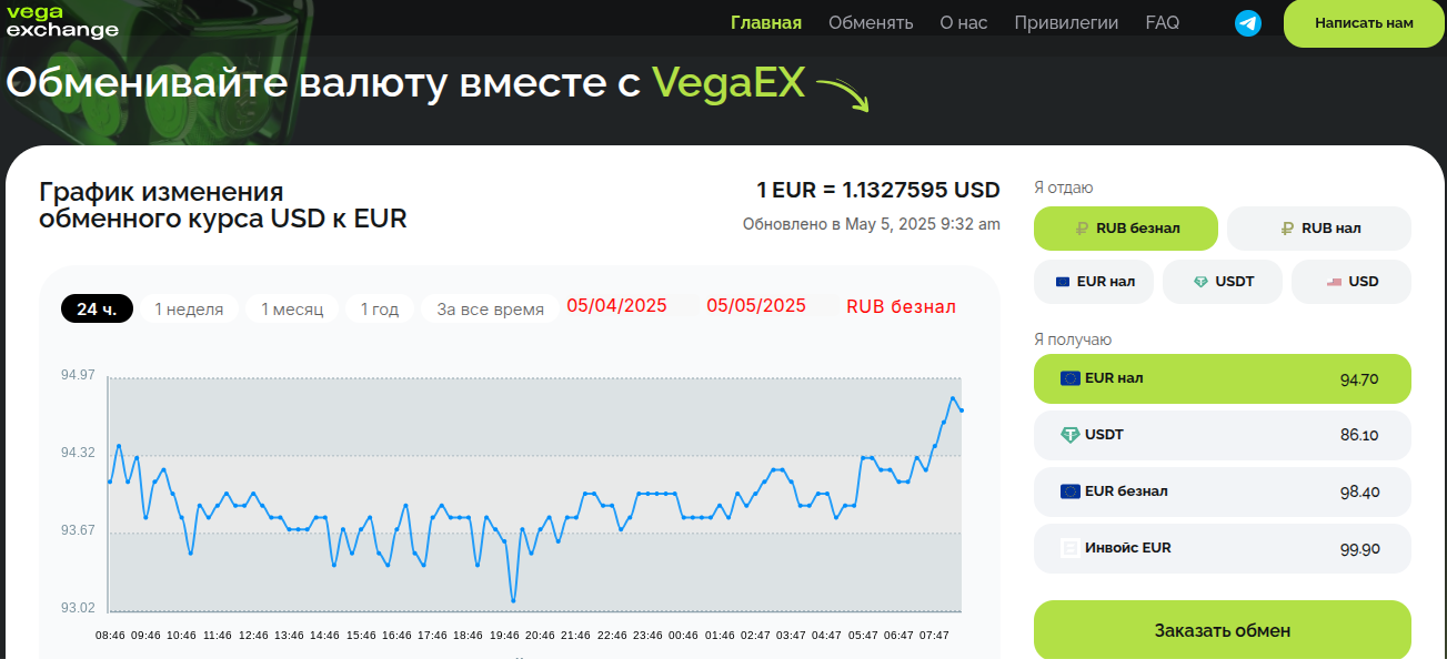 Проект предлагает наличные и безналичные обмены EUR, USD, USDT, RUB. Но конвертация активов — не последний инструмент для обслуживания клиентов. Помимо этого, клиенты могут заказать оплату счетов через контрагентов, покупку недвижимости за рубежом. Стоимость менеджеры Vega Exchange обсуждают с пользователями в индивидуальном порядке.