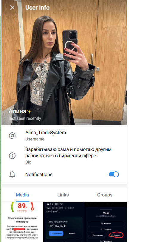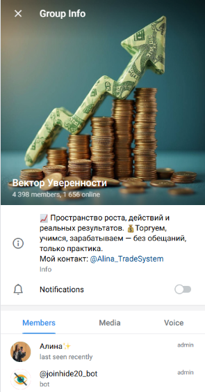 Алина называла телеграмм-канал «Вектор уверенности» пространством для финансового роста, действий и настоящих результатов. «Торгуем, учимся, зарабатываем – без обещаний, только практика» – так было написано в шапке профиля.