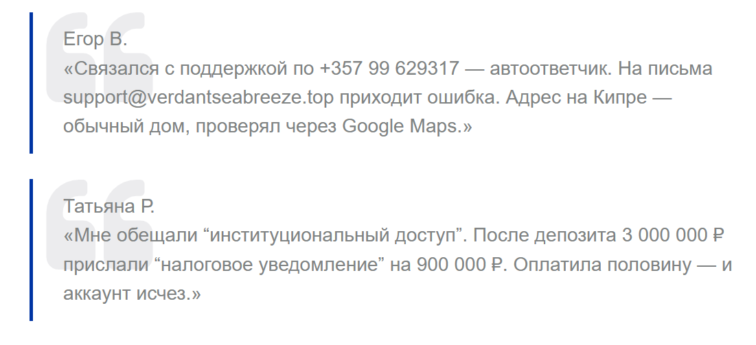 Verdant seabreeze брокер копирует риторику крупных площадок, использует фальшивую инфраструктуру, не подтверждает свои лицензии, не имеет рабочих контактов и действует через поэтапную блокировку депозитов. Вероятность потери денег здесь фактически стопроцентная.