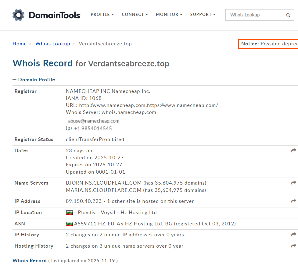 Компания заявляет о том, что существует с 2017 года, но основной домен компании был создан 27 октября 2025 г., ему чуть больше трех недель по состоянию на 19 ноября. Вся информация о владельце скрыта сервисом Privacy Protect. Сервер находится в Болгарии на IP, где размещен еще один сайт.