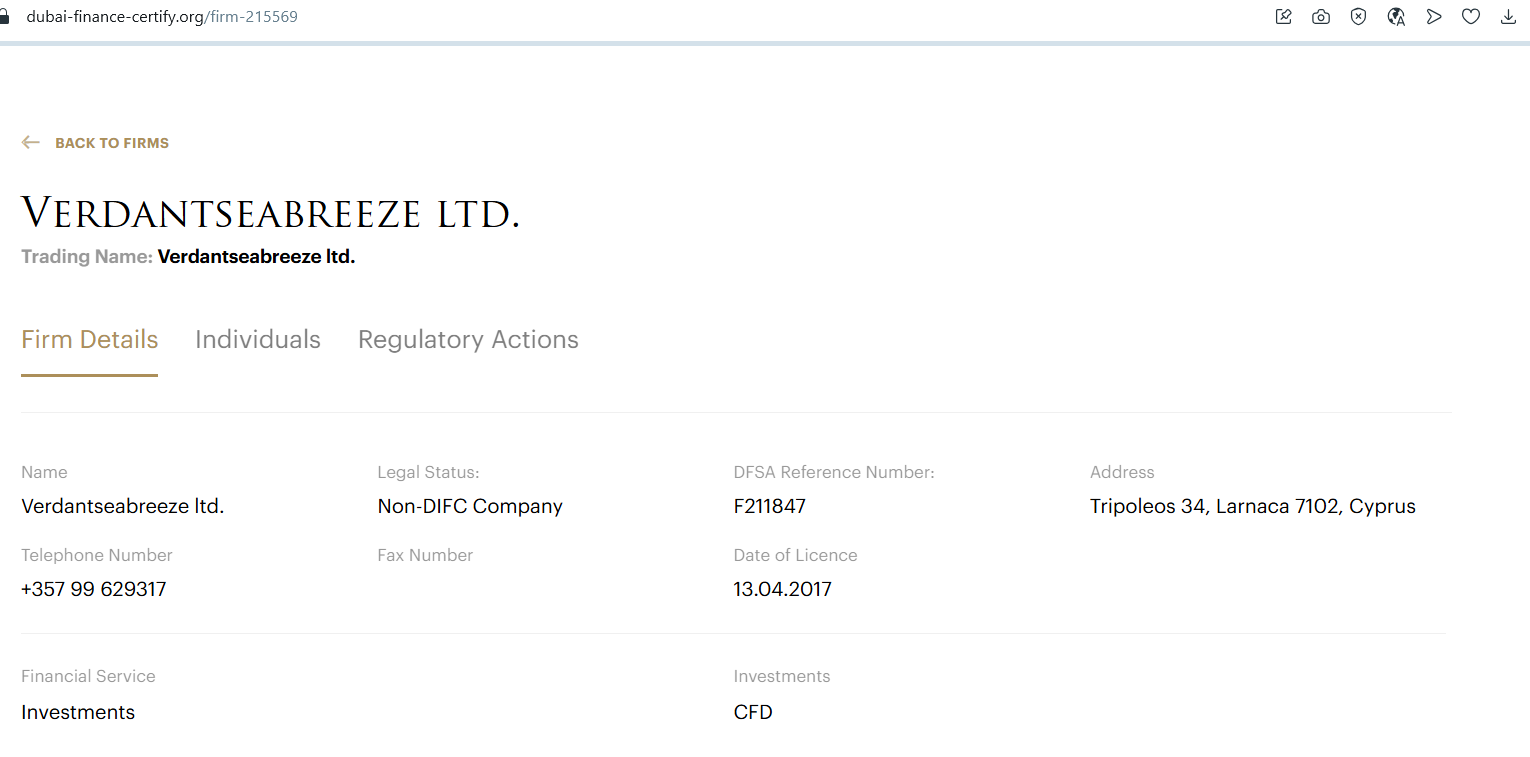 Ссылка на DFSA с номером F211847 также относится к юрлицу Verdant sea breeze Ltd, но это не лицензия на работу брокера и она не дает права предоставлять услуги CFD в ЕС, Великобритании или РФ.
