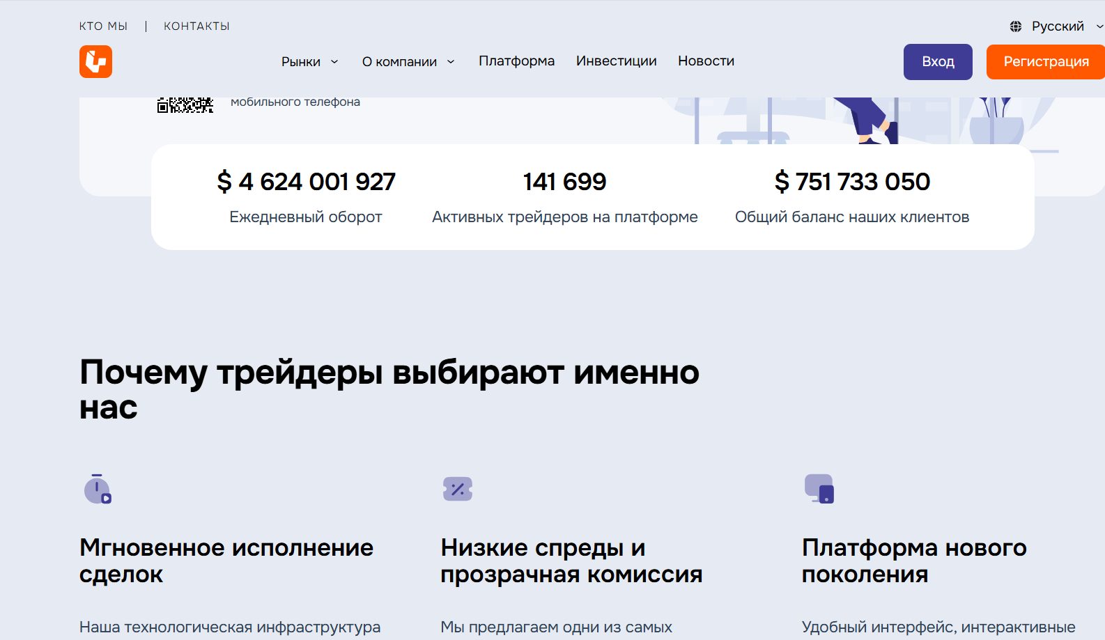 На сайте есть информация о мультиактивной торговле, удобных способах пополнения, защищенных транзакциях, сегрегированных счетах, персональных менеджерах, профессиональных алгоритмах и институциональных инструментах.