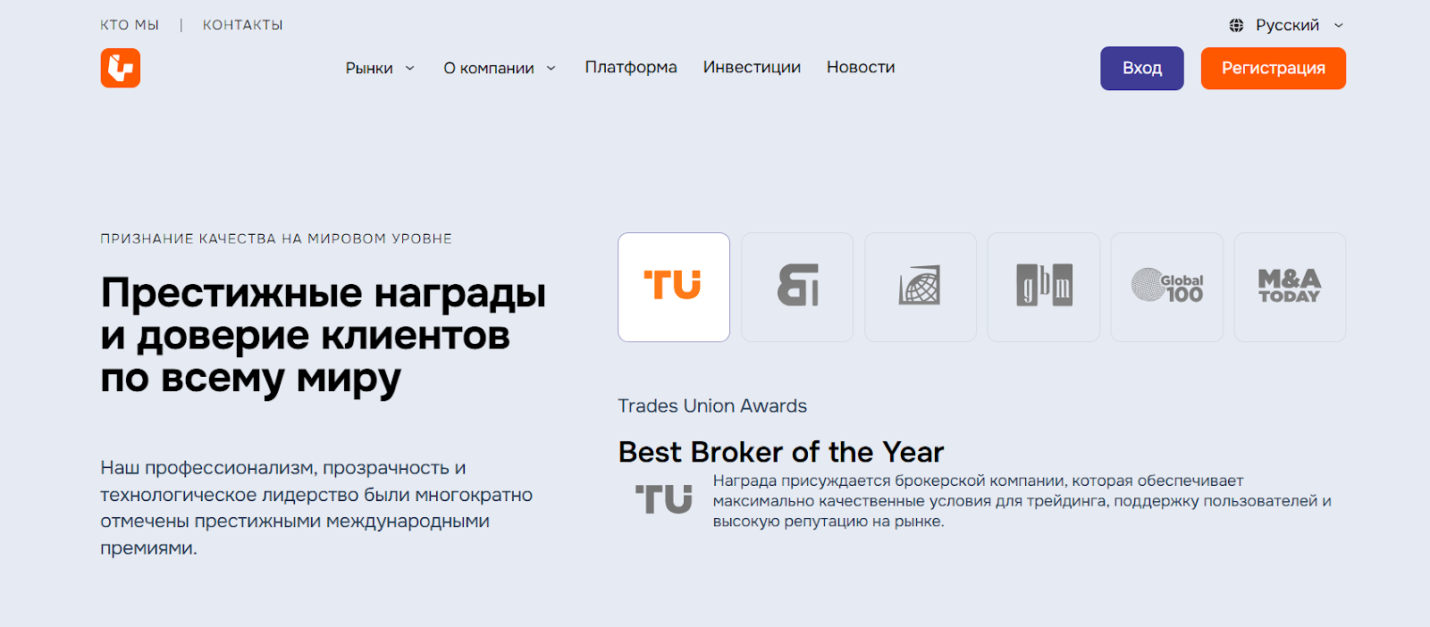 На главной странице наград размещены логотипы Trades Union Awards и “Best Broker of the Year”.