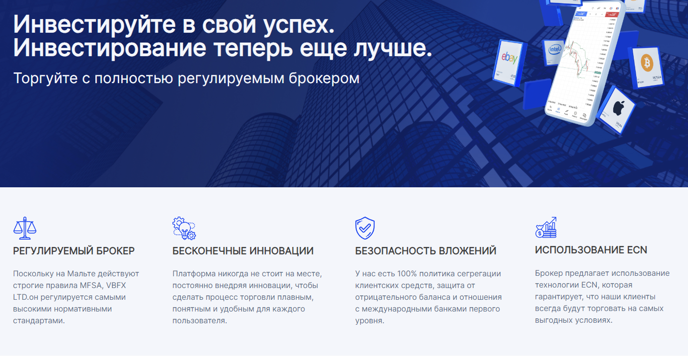 Официальный сайт брокера сразу говорит о том, что организация получила лицензию и регулируется. Абзац «Посколько на Мальте действуют строгие правила MFSA, VBFX LTD, он регулируется самыми высокими нормативными стандартами» вызывает улыбку. Не Европа и не США заставляют компании вести кристальную отчетность, чтобы быть брокером. В 2024 году это Мальта.