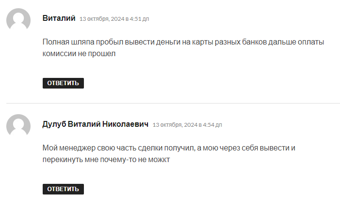 Пользователи в реальных отзывах на Verum Binary указывают, что у брокера есть скрытые комиссии. За пополнение забирают до 2%, при конвертации рублей можно потерять почти 10%. Спреды намного выше, чем в среднем по рынку.