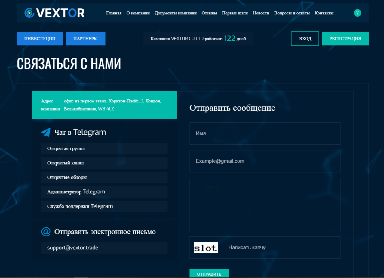 На брокерском сайте клиентам ежедневно с 08:00 до 22:00 доступна служба поддержки. Для связи с администратором и представителями саппорта можно использовать телеграм-каналы erik vextor trade и lanemark. Обратиться к техподдержке также можно с помощью электронной почты support vextor trade.