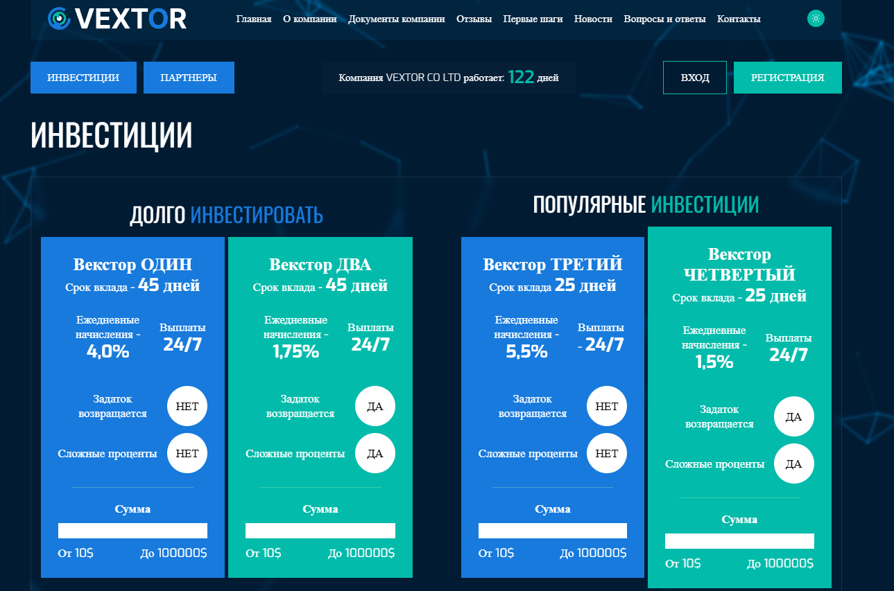 1. Vextor ONE. Срок вклада 45 дней, ежедневная прибыль 4%, депозит от 10 до 100 000 долларов.