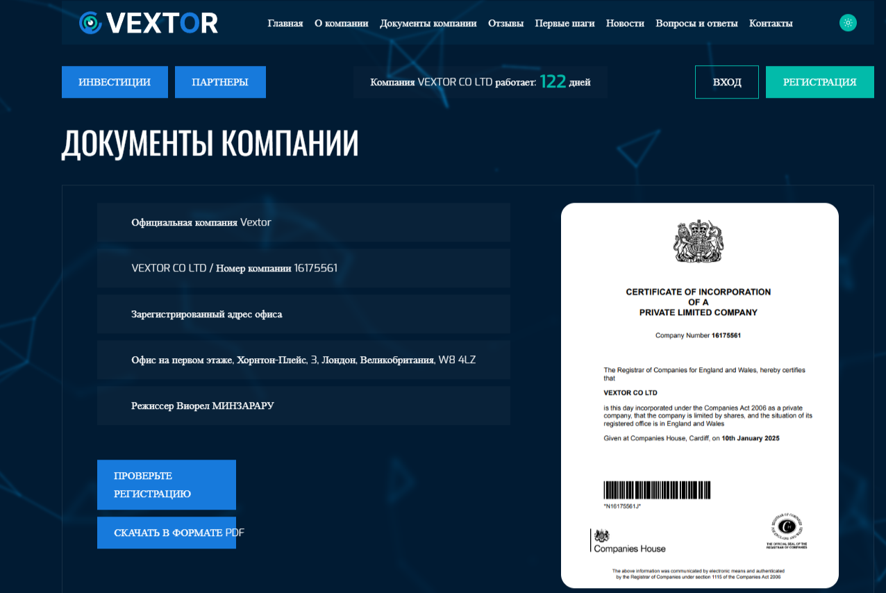 Веб-сайт торговой платформы выполнен в лаконичных темных тонах, обладает простой навигацией. В хедере можно увидеть разделы «Главная», «О компании», «Документы компании», «Отзывы», «Первые шаги» и т. д. Вкладка «Документы компании» содержит информацию об адресе и регистрации организации. Здесь можно узнать, что компания VEXTOR CO LTD зарегистрирована в Лондоне 10 января 2025 года.