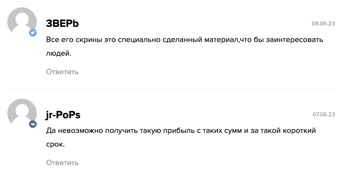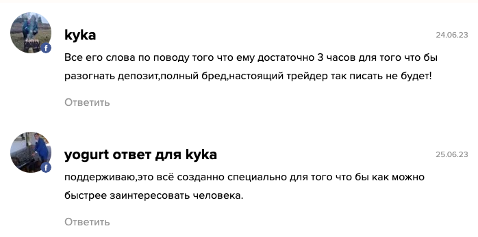 Положительных отзывов на сторонних сервисах не было найдено. В негативных мнениях об этом человеке, люди пишут, что с них были взяты крупные суммы денег и не отданы. Пользователи уверяют, что автор специально завлекает клиентов, обещая высокий процент с раскрученного депозита.