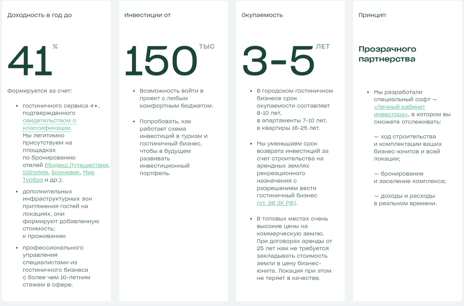 • Срок окупаемости — от 3 до 5 лет. Для достижения такого показателя строительство недвижимости ведется в уникальных местах, что позволяет поднимать цены на аренду и получать большую прибыль.