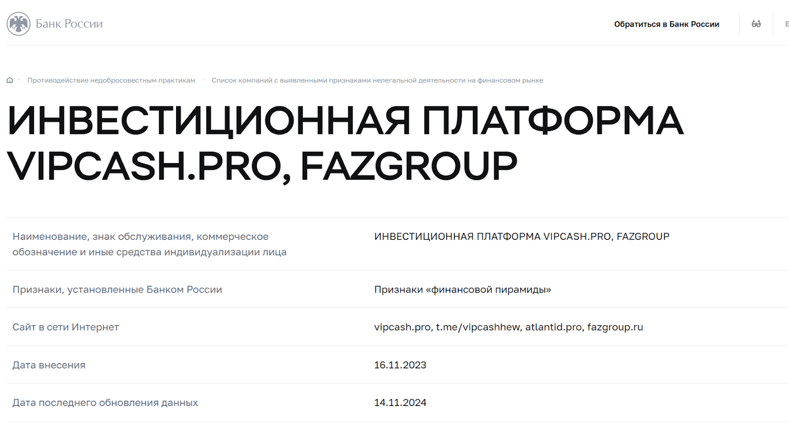 16 ноября 2023 года Банк России включил VipCash в список предупреждений о признаках финансовой пирамиды. В нем указаны связанные сайты как ресурсы с выявленными нарушениями в привлечении средств без надлежащего контроля.