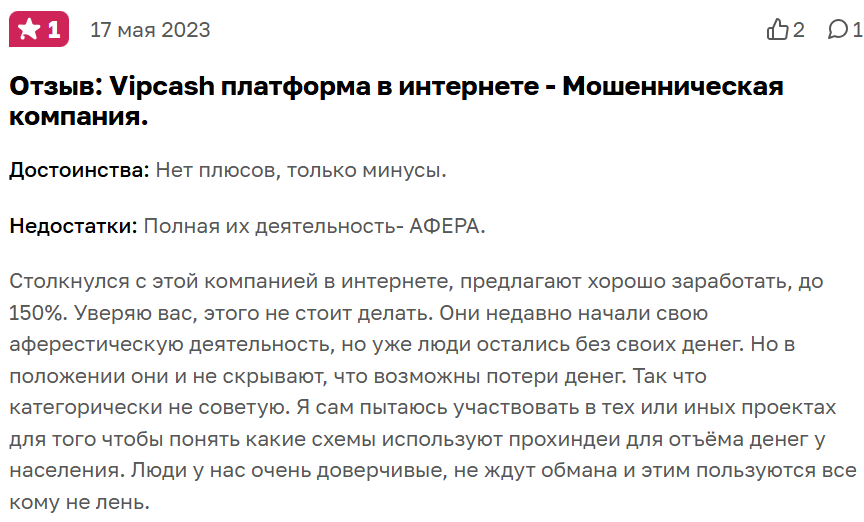 На независимых платформах представлены негативные отзывы о проекте VipCash. Трейдеры указывают, что столкнулся с фирмой в интернете, где им предлагали заработать до 150% прибыли. После начала участия они осознали схему развода, при которой люди остаются без своих денег. Организаторы открыто предупреждают о возможных потерях, чтобы избежать ответственности.
