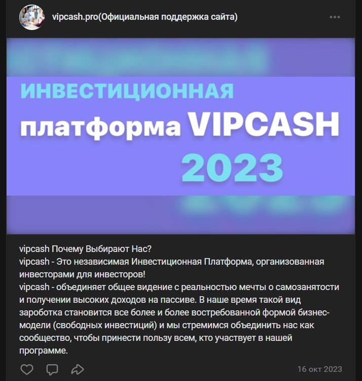 Дата регистрации Vipcash pro соответствует первым публикациям в тг-канале и упоминаниям в социальных сетях, где платформа начала продвигаться как инвестиционный инструмент. Внесение в черный список ЦБ РФ произошло 16 ноября 2023 года.