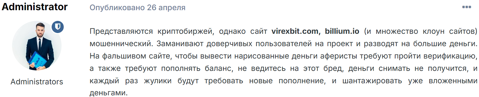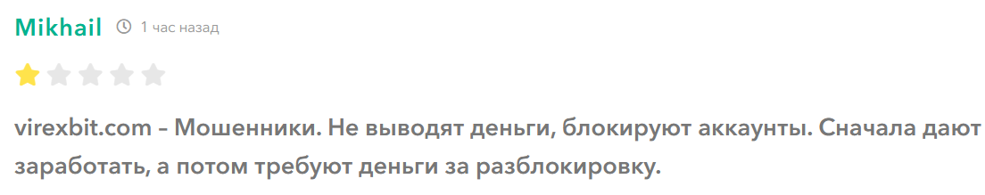 Отзывы о Virexbit в интернете негативные. Один из трейдеров называет биржу мошеннической, поскольку она блокирует аккаунты и не выводит средства пользователей.