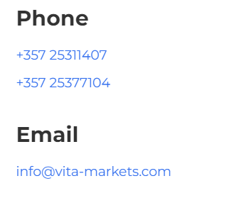 Чтобы обратиться в официальную службу поддержки брокерской организации, нужно либо написать письмо на электронную почту info@vita-markets com, либо позвонить по номеру телефона +357 25311407 или +357 25377104