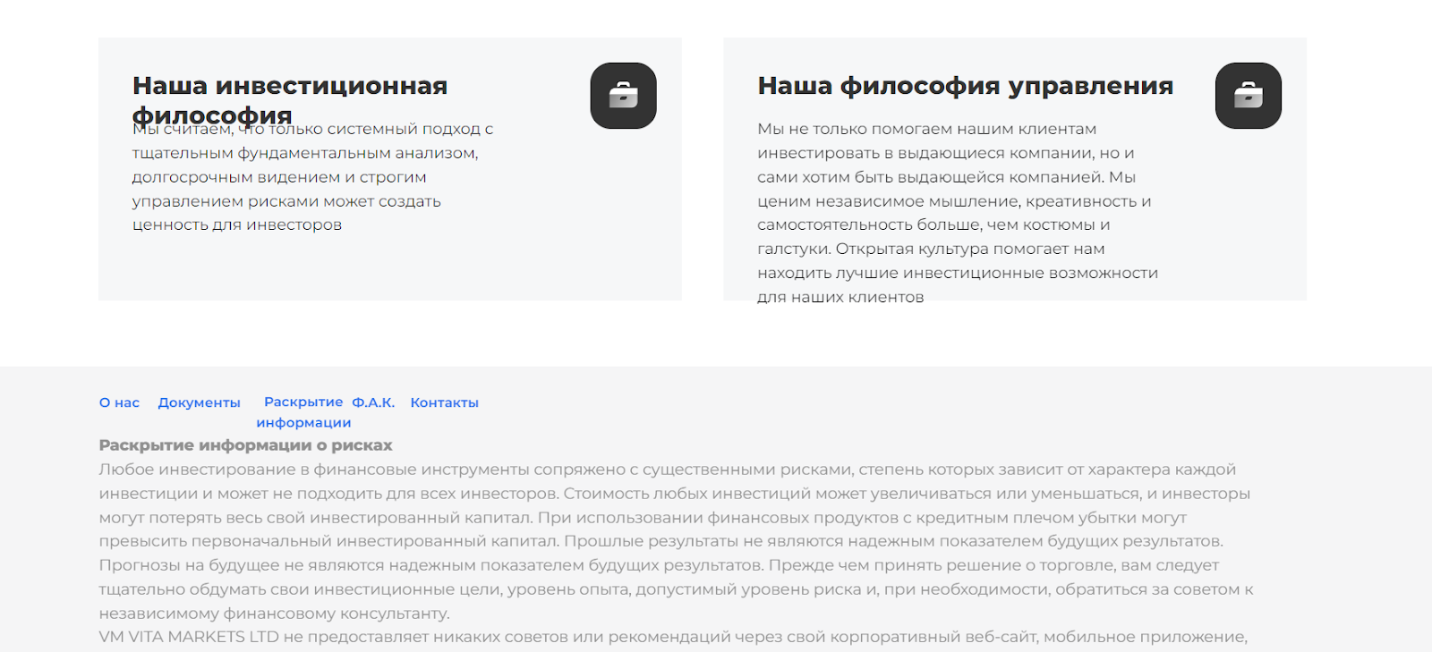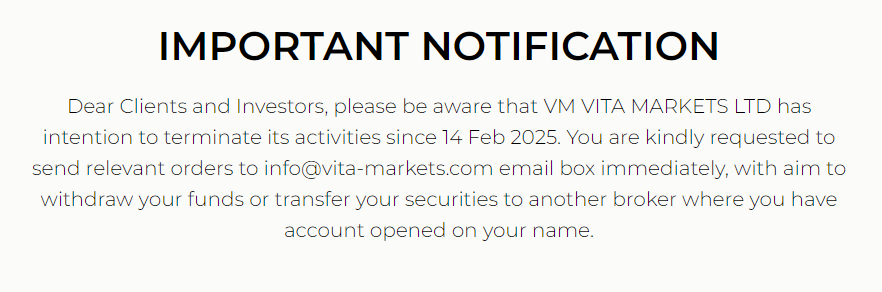 На сайте Vita Markets com указано лишь, что «организация не только хочет помочь клиентам инвестировать в невероятные проекты, но и сама быть исключительной» — именно так звучит философия компании. Возможности торговать нет, ведь компания покидает сферу 14 февраля.
