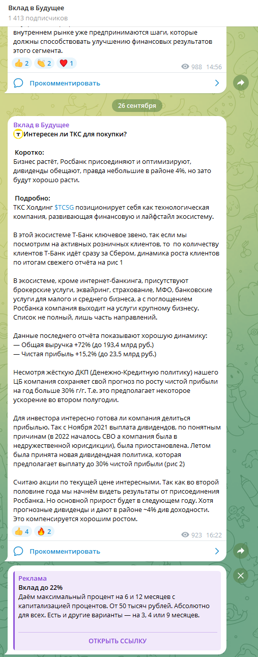 Выводы и отзывы о канале в ТГ «Вклад в будущее»