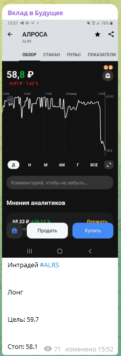 Судя по контенту канала в ТГ «Вклад в будущее», инвестор специализируется на трейдинге российскими акциями. На основе технического анализа он находит перспективные позиции для инвестирования и предоставляет информацию подписчикам.