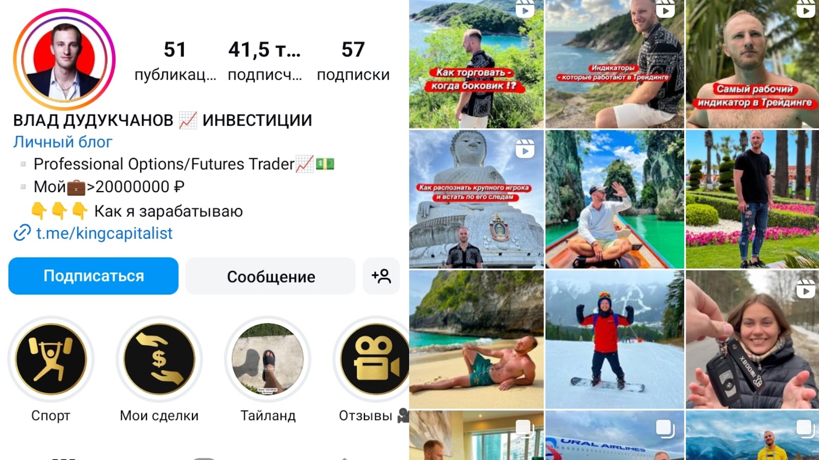 У трейдера Vlad есть Инстаграм страница Dudukchanov. Она функционирует с 2019 года. Ее аудитория — 41.5 тысяч людей. Канал является более популярным.